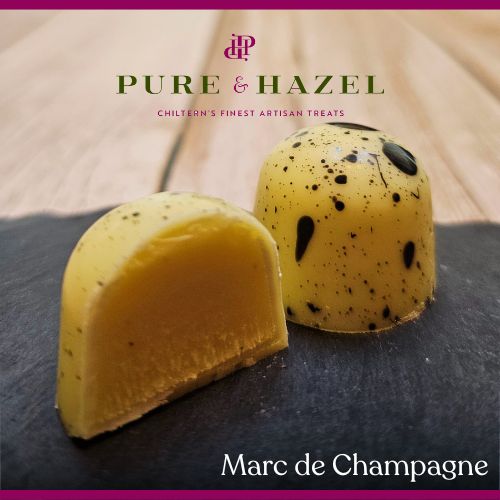 A slightly boozy Marc de Champagne ganache with a smooth vanilla finish enclosed in a white chocolate shell